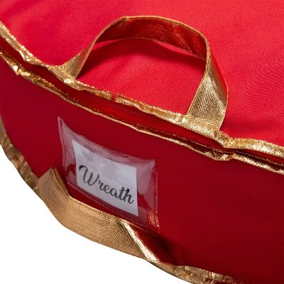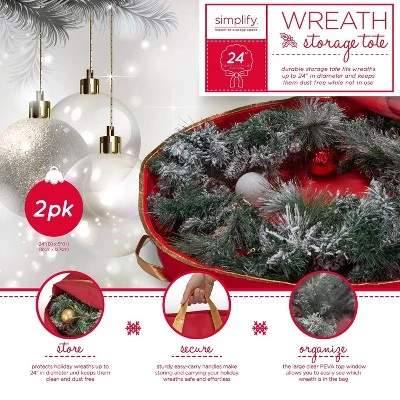 Keep those beautiful Holiday wreaths in tact by storing them in the Simplify Holiday Wreath Bags. Holding wreaths up to 24″ in diameter, the bag protects from dust and dirt during the off season. A zippered closure and sturdy carrying handle keeps the wreaths secure while storing them away. Easily identify the wreath stored away with the convenient large clear window that allows you to view what is inside and the label window on the front of the bag. Perfect for storing all holiday wreaths throughout the year!