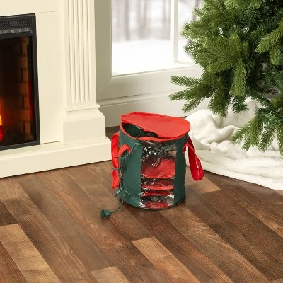 Christmas lights are a chore to store, but it doesnât have to be! Keep your string lights under control with this festive organizer. It comes equipped with sturdy nylon handles for easy carrying and a clear clastic front to easily view what is inside without the need to unzip the bag. Beyond organizing string lights, the versatile bag can be used to store art supplies, crafts, and holiday dĂ©cor and ornaments. Collapsible when not in use.