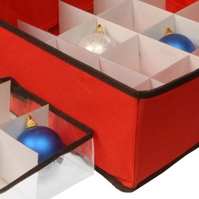This efficient container provides safe and organized packing of ornaments for after holiday storage. It is constructed of durable stitched seam polyester material with zippered lid and convenient carry handles. The piece contains two removable cardboard dividers that allow for the storage of up to 52 ornaments.