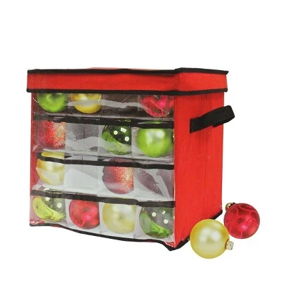 Now that the holidays are over and it is time to put away your holiday decor. Safely store your treasured holiday ornaments without compromising their fragility or style in this protective storage bag. Protect up to 64 fragile ornaments in this convenient container. It makes storage and retrieval easy for each season.Product Features:Red and clear square holiday ornament storage bagCarrying handles for easy transporting and storageDividers and trays help protect and organize ornamentsTranslucent exterior construction helps identify contentsSelf-supporting walls Tear resistantGreat for stockings, tree skirts, garland, tree toppers and moreDimensions: 12″H x 12″W x 12″DMaterial(s): plastic/fabric/metalNote: storage bag only – ornaments not included