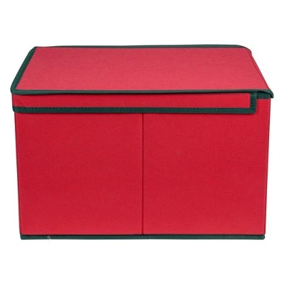 Organize your holiday decorations with ease using this tear-resistant collapsible storage box. This box is perfect for storing all your holiday decorations, including ornaments, garlands, lights, and more. With its durable construction, it can withstand wear and tear, ensuring that your decorations stay safe and secure all year round. The box features a clear view ID window for labeling, making it easy to identify your decorations without having to open each boxProduct Features:Red and green rectangular holiday decoration storage boxHandle for easy transporting and storageLarge enough to accommodate different sizes of holiday decorationSelf-supporting walls and collapsible design essential for easy storage of the boxMade of tear-resistant canvas material to ensure durability and longevity The clear view ID window allows for easy labelling and identification of the contents inside the boxSturdy base that can support the weight of the decorations without collapsing or tearingRecommended for indoor use onlyDimensions: 10”H x 12”W x 16”DMaterial(s): canvas/plasticNote: storage box only – decorations not included
