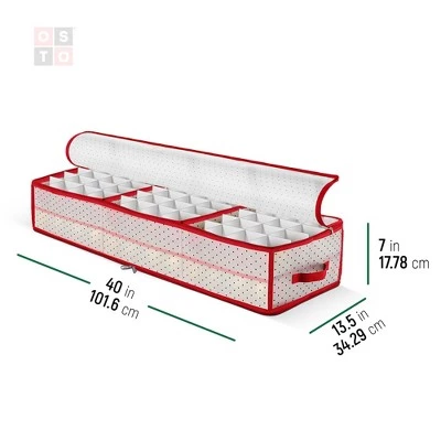 - Ornament Storage-Ornament storage box is cardboard-divided in 96 slots for ornaments, accessories, or other holiday embellishments of 3”. Box features 6 trays, a pair of hand grips, and comes in a variety of 3 colors to add to the holiday spirits. Dimensions: 7” x 40” x 13.5”
